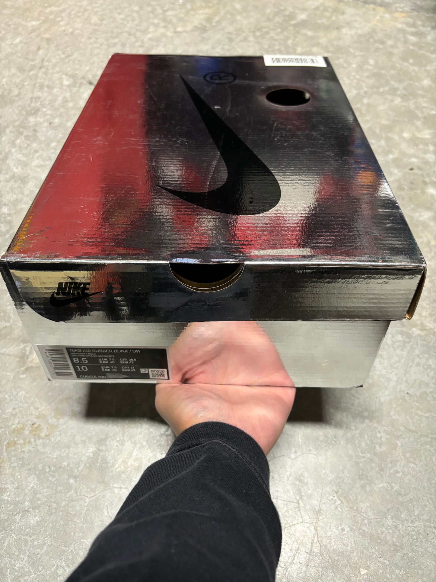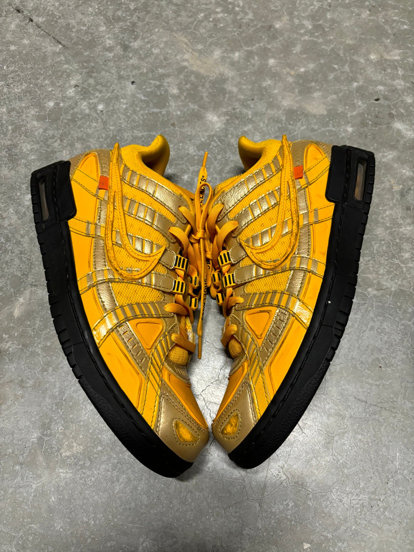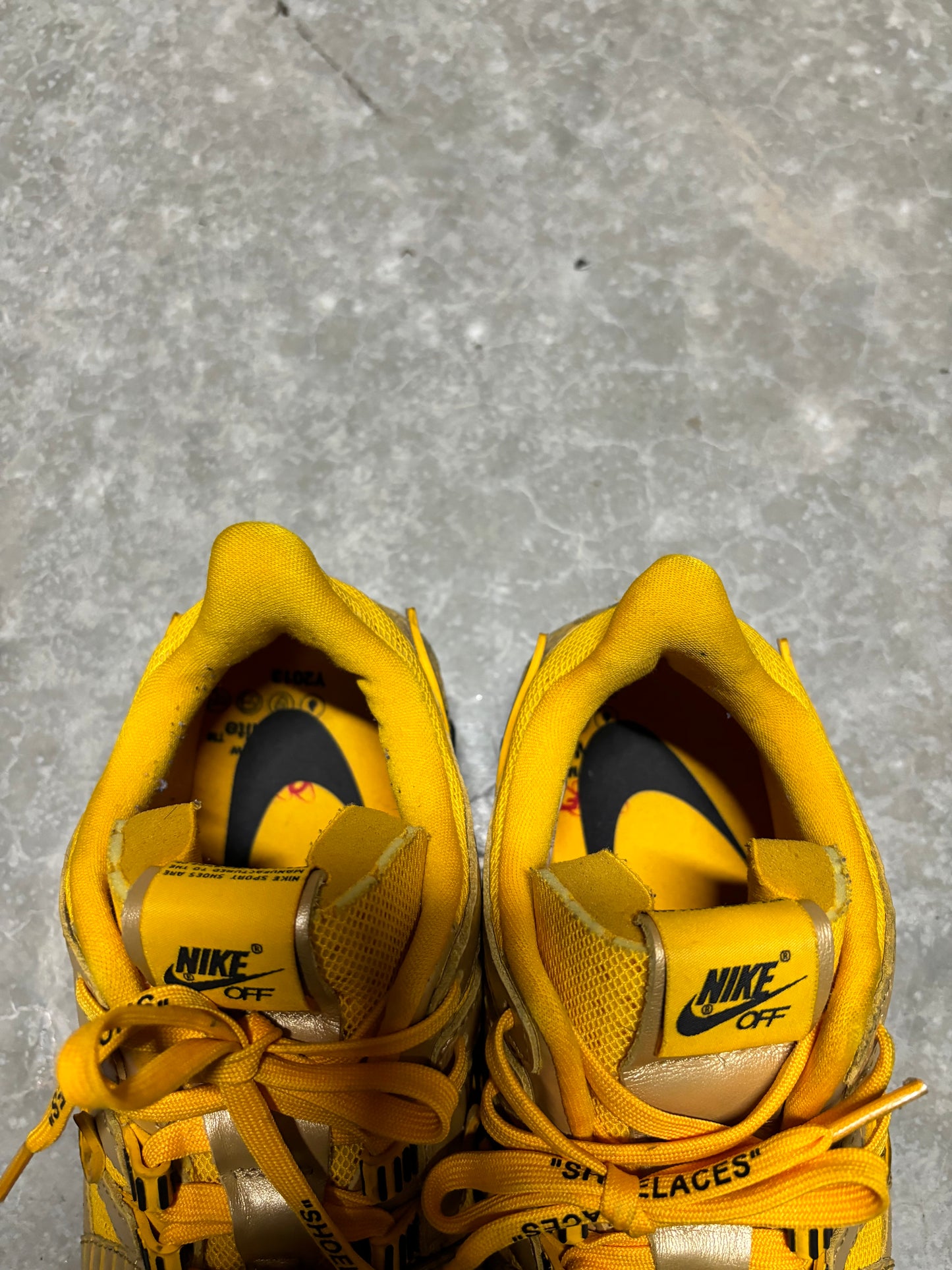 OFF WHITE RUBBER DUNKS “ university gold “